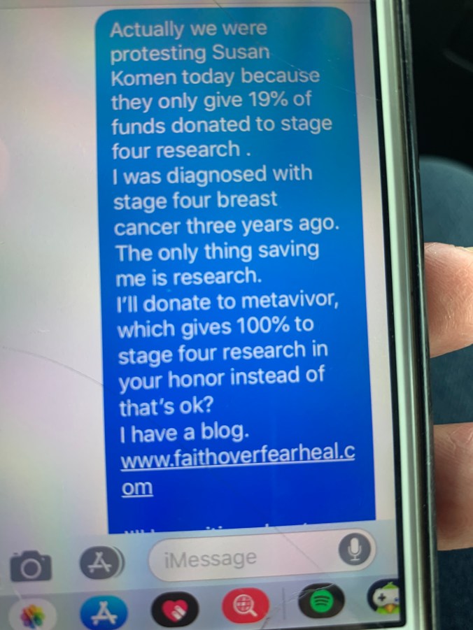 That’s why I keep banging the gong how stage four needs more. One day your fine, and in hours suddenly you’re not. I’ve had friends go downhill and die so quickly. That can’t be my story. In October, don’t buy pink crap to support breast cancer. Support metavivor, where research for stage four is where their money goes. Or north fork breast health coalition which offers support for women going through treatments.